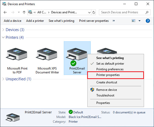 On Windows 11/10 and Windows server 2022/2019/2016/2012 the created Task Emails appear in the Control Panel > Devices and Printers in a grouped form under the Print2Email. Right-click on the Print2Email and go to Printing Properties / Printing Preferences for the Task Email.