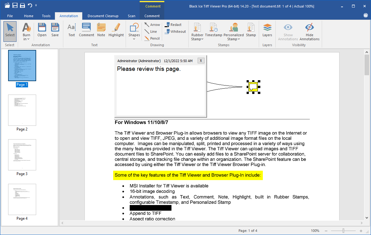 The TIFF Viewer Pro allows users to view, print, OCR, annotate, search (and redact highlighted search matches) documents, scan, batch scan, email, and edit TIFF images, Faxes, medical Faxes through the standalone user interface. The Tiff Viewer can display Microsoft Office Document Imaging (MODI) annotations, OCR data, and WANG annotations.