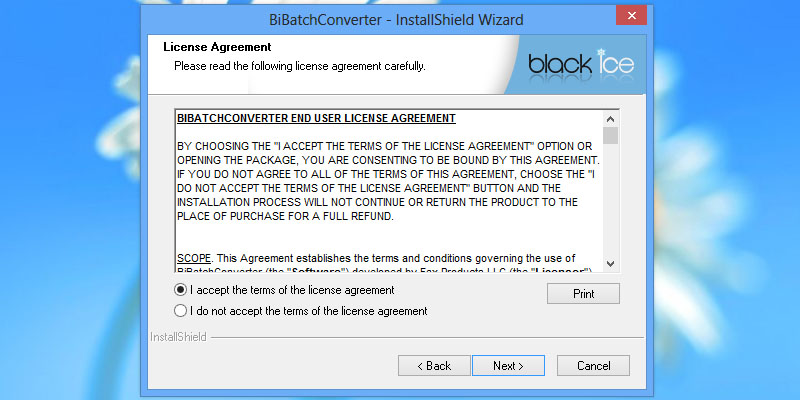 To begin installation, double click on the downloaded BiBatchConverter.The following screen will be displayed. Click the 'Next' button to continue.Review the license agreement, and select 'I accept the terms of the license agreement' radio button. Press 'Next' to continue.The next screen will present an option of installing BiBatchConverter for all users or just the current user. Press 'Next' to continue.Select the installation directory of the BiBatchConverter or use the default destination folder. Press 'Next' to continue.Select the output directory of the printed documents. Press 'Next' to continue.Specify the desired name for BiBatchConverter to appear under Start > Programs or use the default settings. Press 'Next' to continue.The following window appears, if the installer detect some locked files. Press 'Yes' to continue.The InstallShield Wizard will install the Black Ice BiBatchConverter.The following dialog will appear, and the user can select to 'Place program shortcut icon on desktop,' and 'View BiBatchConverter documentation.' Press the 'Next' button to continue.The installations is complete. Press the 'Finish' button to continue.On the following window, click on Yes to activate the BiBatchConverter with a valid serial number obtained during the purchase, or Click No and BiBatchConverter registers as Demo. BiBatchConverter Demo can be used for 15 days. A window will appear confirming that the BiBatchConverter Demo has successfully registered over the internet. Thank you for using Black Ice BiBatchConverter. Click here to see more tutorials.