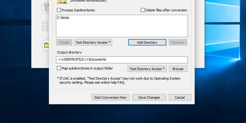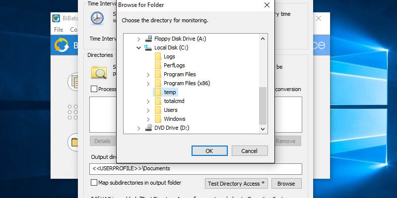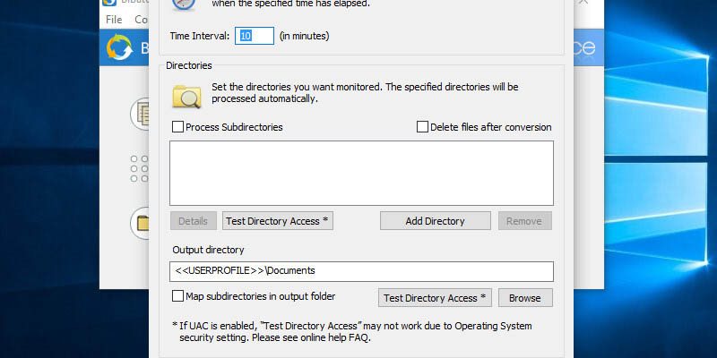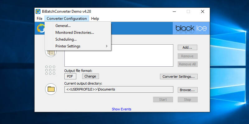 Run the BiBatchConverter.On the BiBatchConverter user interface, go to the Converter Configuration > Monitored Directories... optionIn the Set Monitored Directories, configure the desired settings and time interval.Click on the 'Add Directory' button to add a directory to be monitored.When finished, click the 'Save changes' button to apply the changes, and the BiBatchConverter will start monitoring the directory automatically. Thank you for using Black Ice BiBatchConverter. Click here to see more tutorials.