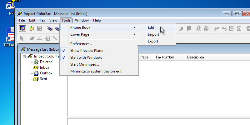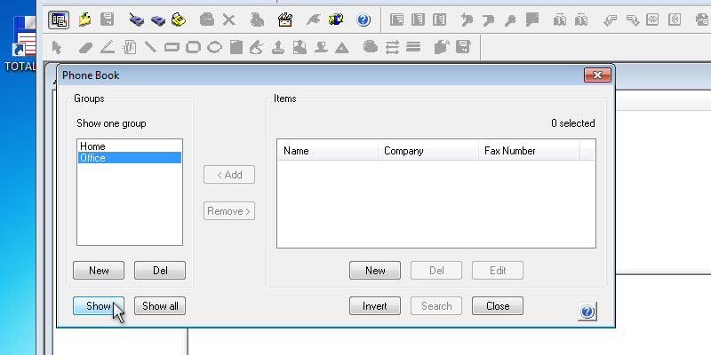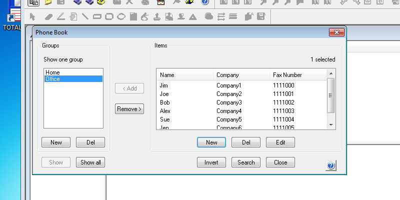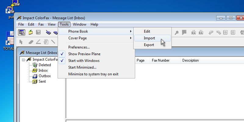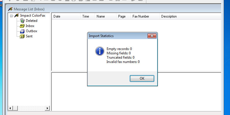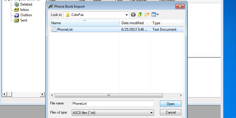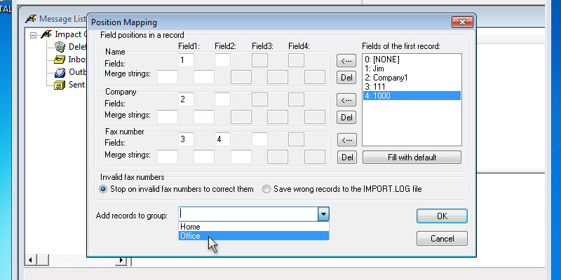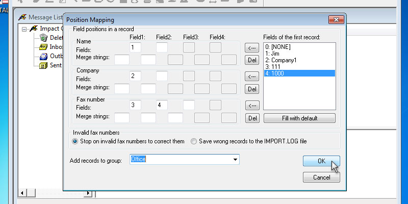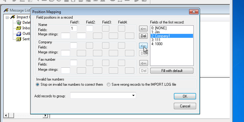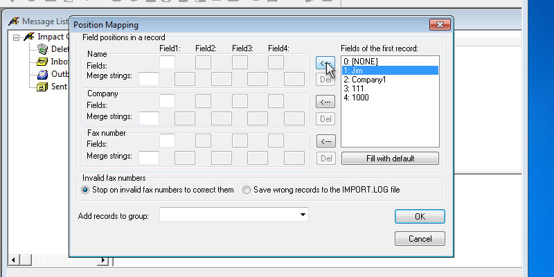 Start the Impact ColorFax from the Start menu.In the Impact ColorFax, go to the Tools > Phone Book > Import.Browse the phone list to be imported.The text file to be imported looks like this.The Position Mapping windows appears.Select the name field, represented by the first record in the text file to be imported, and click on the <-- button. The Name/Fields/Field1 text box shows that item 1 in the Fields of the first record will be imported into the Name field. When finished, select the Company, and click on the <-- button. The Company/Fields/Field1 text box shows that item 2 in the Fields of the first record will be imported into the Company field. When finished, select the Fax number, and click on the <-- button.In this case, the fax number is split into two fields. However, Impact Colorfax has built in functionality to solve this issue. When finished, select the group where to add the records.When finished click on the OK button.The Import Statistics window opens and displays the outcome of the attemted import. Click OK to close this windows.Go to the Tools > Phone Book > Edit option.The Phone Book windows opens. Select the group with the imported contacts, and click on the Show button.All contact in the group are shown. Thank you for using Impact ColorFax. Click here to go back to the Tutorials.