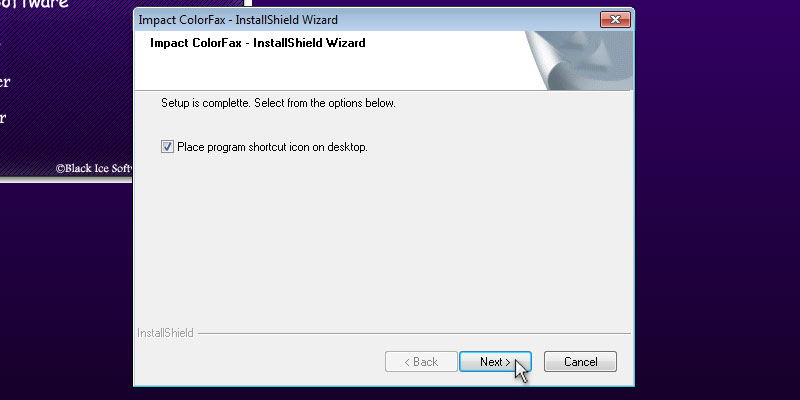 To begin installation, double click on the downloaded ColorFax.The following screen will be displayed. Click the 'Next' button to continue.Review the license agreement, and press 'Yes' button to continue.Select the installation directory of the ColorFax or use the destination folder. Press 'Next' to continue.Specify the desired name for ColorFax to appear under Start > Programs or use the default settings. Press 'Next' to continue.Enter the identification text (CSID). The CSID identifies your computer when you send a fax. The information you insert into the CSID field is entered into the header of the fax. You can enter anything you want; however a typical CSID is your name, company or fax number.The following dialog will appear, and the user can select to 'Place program shortcut icon on desktop.' Press the 'Next' button to continue.Press Finish to complete the installation.