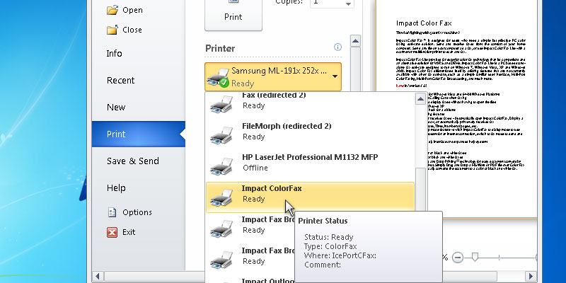 Open a document to be faxed.Print the document to the Impact ColorFax virtual printer driver.Impact ColorFax Send window opens automatically.Select the fax number from the Phone Book or enter the fax number manually, and click on the Send button.Impact ColorFax Fax Manager opens and send the printed document. Thank you for using Impact ColorFax. Click here to go back to the Tutorials.