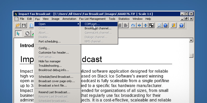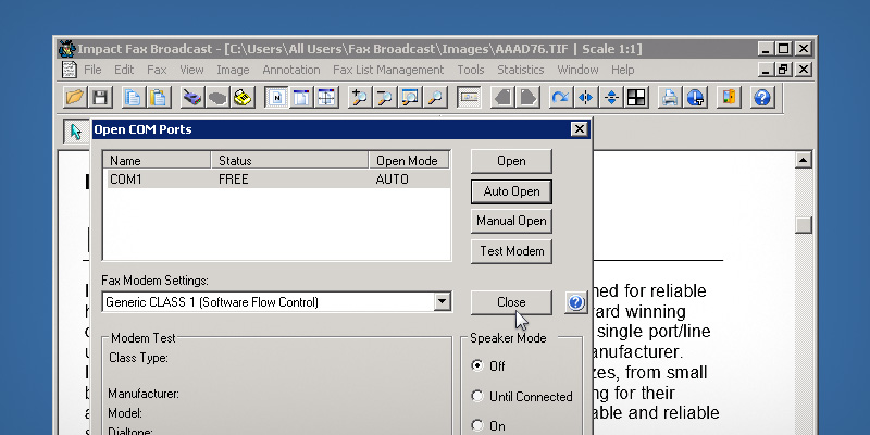 Impact Fax Broadcast can be configured to Automatically Open a COM Port during startup.Open Impact Fax Broadcast.To configure the automatic port opening, go to the Open > COM port...The Open COM Ports window opens. Select the desired COM port, and click on Auto Open button.The Open Mode column next to the selected COM port changes to AUTO, if the configuration successfull.Next time when the user start Fax Broadcast, the selected COM Port automatically opens. Thank you for using Impact Fax Broadcast. Click here to see more tutorials.