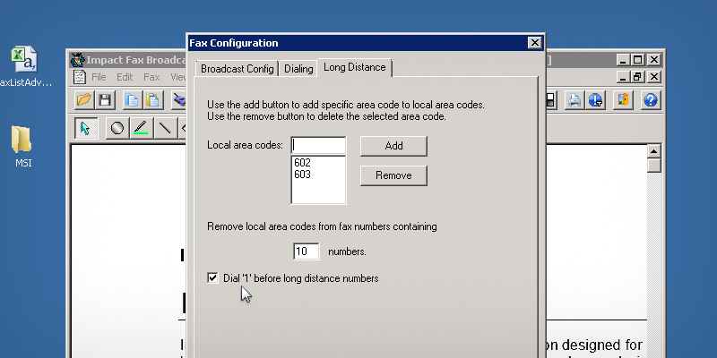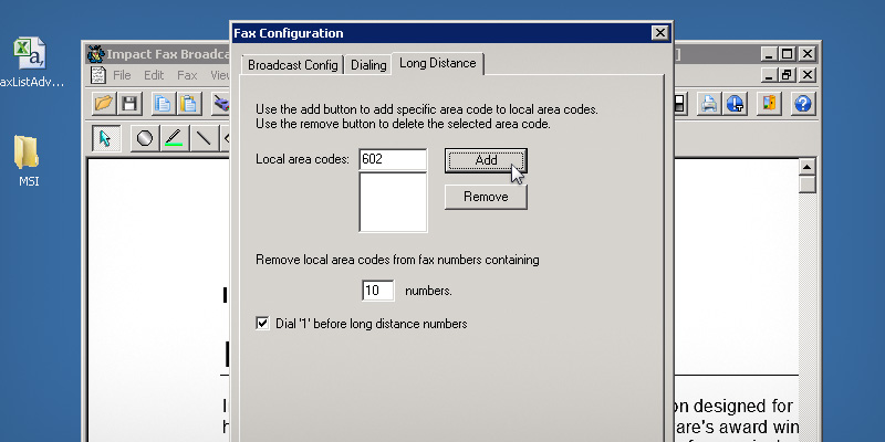 Run the Impact Fax Broadcast.To configure local and long distance fax numbers, go to the Fax > Config...The Fax Configuration window appears. Click on the Long Distance tab and enter the area code next to the Local area codes. Click Add to add the area code to the list.Optionally, the user can add more than one area codes. All area codes will be removed from fax numbers before attempting to dial out.If applicable, make sure the Dial '1' before long distance numbers option is selected. When finished, click OK button to apply the changes. Thank you for using Impact Fax Broadcast. Click here to see more tutorials.