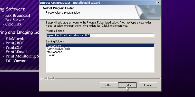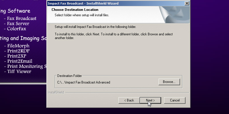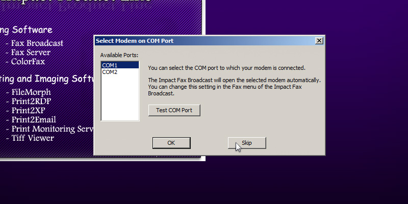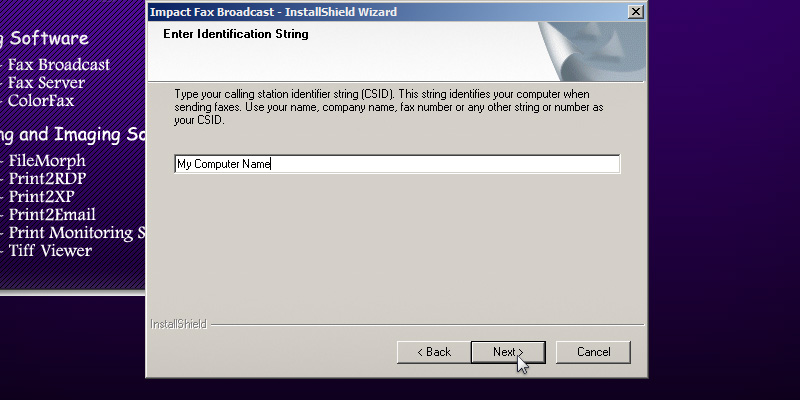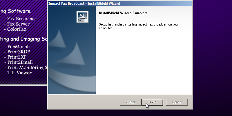 To run the Impact Fax Broadcast install, double click on the downloaded Impact Fax Broadcast.The following screen will be displayed. Click the 'Next' button to continue.Review the license agreement, and press 'Yes' to continue.Select the installation directory of the Fax Broadcast or use the default destination folder. Press 'Next' to continue.Specify the desired name to appear under Start > Programs or use the default settings. Press 'Next' to continue.Type the CSID (calling station identifer string). This string identifies the computer when sending faxes.The InstallShield Wizard will install the Impact Fax Broadcast.The following window will appear, and the user can select the desired options and press the 'Next' button to continue.A window appears asking if the user want to install Brooktrout Driver. A brooktrout card is a high-end faxing board. Select 'No' and press 'Next' to continue.The Select Modem or COM port window appears. The user can select and test which port is the modem connected to. Select the COM port or click the Skip button.Press Finish to complete the installation. Thank you for using Impact Fax Broadcast. Click here to see more tutorials.