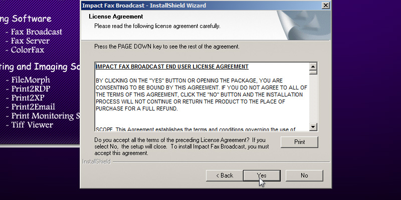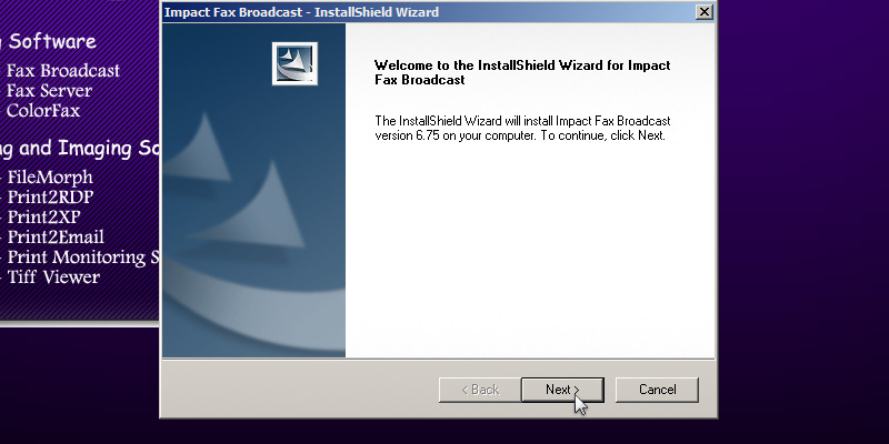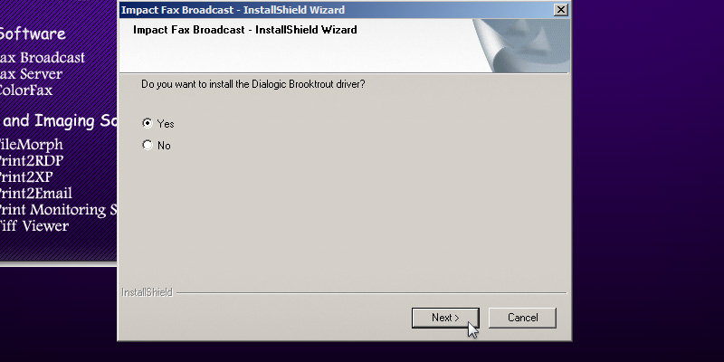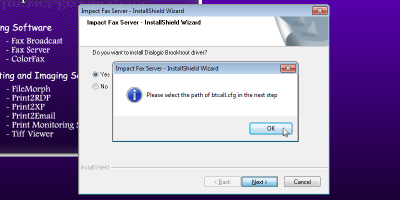 To run the Impact Fax Broadcast install, double click on the downloaded Impact Fax Broadcast.The following screen will be displayed. Click the 'Next' button to continue.Review the license agreement, and press 'Yes' to continue.Select the installation directory of the Fax Broadcast or use the default destination folder. Press 'Next' to continue.Specify the desired name to appear under Start > Programs or use the default settings. Press 'Next' to continue.Type the CSID (calling station identifer string). This string identifies the computer when sending faxes.The InstallShield Wizard will install the Impact Fax Broadcast.The following window will appear, and the user can select the desired options and press the 'Next' button to continue.A window appears asking if the user want to install Brooktrout Driver. A brooktrout card is a high-end faxing board. Select 'Yes' and press 'Next' to continue.The Dialogic Brooktrout Runtime Software installation program will automatically start. Press the 'Next' button to continue.Select the installation directory of the Brooktrout driver or use the default destination folder. Press 'Next' to continue.Click on the 'Install' button to begin the installation.The InstallShield Wizard will install the Brooktrout Driver.During the installation, a command line will appear as part of the installation.Click Finish to run the Configuration Tool.In Brooktrout Config Tool, the user can configure the Brooktrout board preferences. Click 'Yes' to configure the board now, otherwise click 'No'.The following window box will appear where the user can specify the location of the configuration files. When finished, click 'OK'.A Windows security alert may appear. Allow Brooktrout Configuration tool to communicate with public networks.The Brooktrout Configuration Tool Advanced mode contains essential information about how to use the Tool effectively. If finished, Save and close this window.To select the path of btcall.cfg window, click on the 'OK' button.Specify the location of the configuration file. If finished, click on the 'OK' button.The Select Modem or COM port window appears. The user can select and test which port is the modem connected to. Select the COM port or click the Skip button.Press Finish to complete the installation. Thank you for using Impact Fax Broadcast. Click here to see more tutorials.