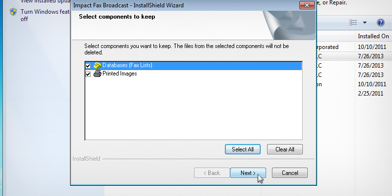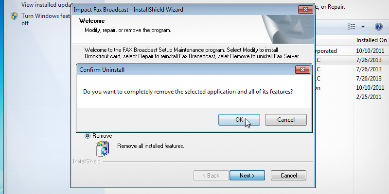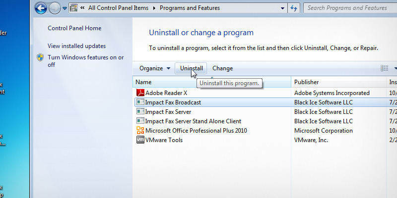 Go to Start menu and select Control Panel.In the Control Panel, click on the Programs and Features.Select the Impact Fax Broadcast and click on the Uninstall button.WindowsThe InstallShield Wizard opens. Select the Remove option and click NextWindows asks confirmation to remove the application and all of its features. Click the 'OK' button to continue.Select the components to keep and click Next to uninstall the Impact Fax Broadcast.Press Finish to complete the installation. Click here to see more tutorials.