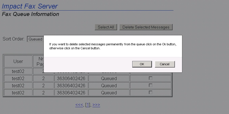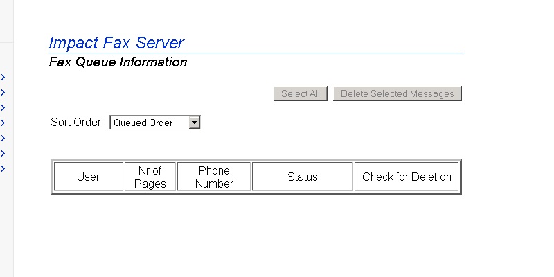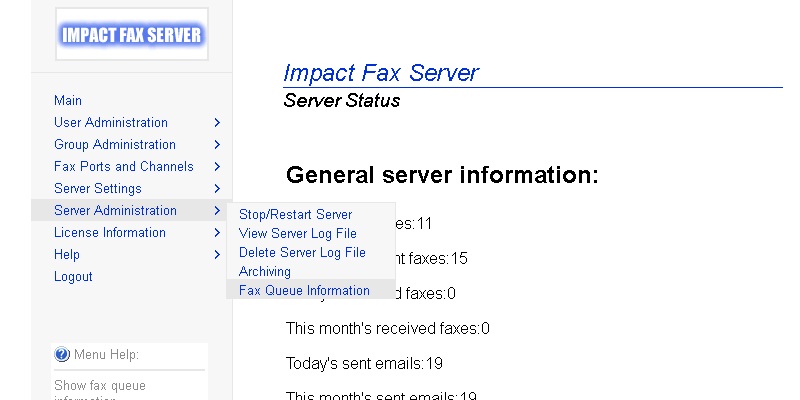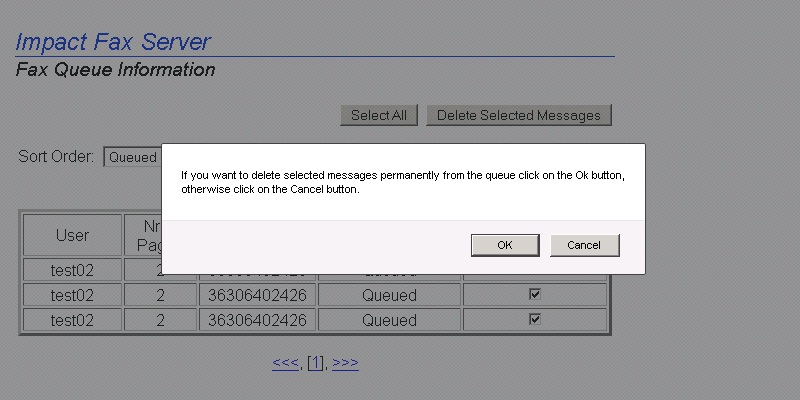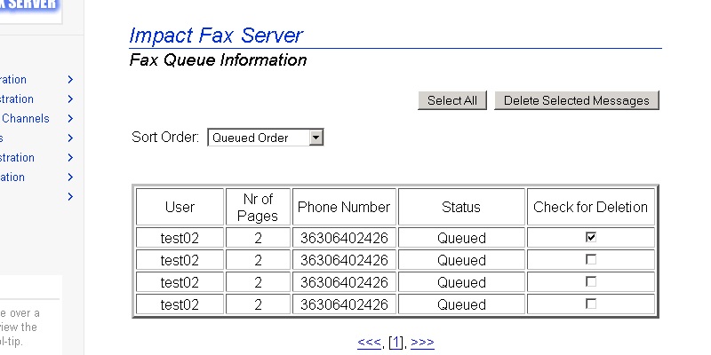 To reach the Impact Fax Server Administrator login, open a web browser and type localhost:1172 as a regular website. Enter the password and press Submit button.The Fax Server Administration page appears. All general information about the server can be found on this Main page.Go to the Server Administration > Fax Queue Information.The Impact Fax Server Fax Queue Information page appears. To delete one fax item check the checkbox under the Check for Deletion column, and press Delete Selected Messages button.The following dialog appears. Click the OK button to delete the selected fax item.To delete every fax item click on the Select All button, and press Delete Selected Messages button.The following dialog appears. Click the OK button to delete every fax item.The empty Fax Queue Information page appears. Thank you for using Impact Fax Server. Click here to see more tutorials.