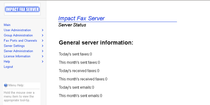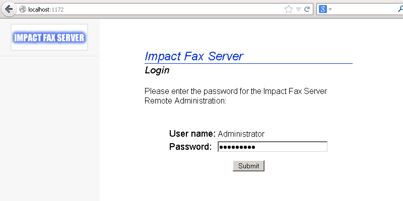 To reach the Impact Fax Server Administrator login, open a web browser and type localhost:1172 as a regular website.Enter the password, and click on the 'Submit' button.The Fax Server Administration page appears. All general information about the server can be found on this Main page.Go to the Fax Ports and Channels > Open/Close.Click on the appropriate COM port. NOTE: If the desired COM port is not displayed, make sure that the port is not in use by any other application ( even if an application is closed it could still be using the port )Scroll down on the page, and enter the preferred prefix beside the Phone Nr Prefix. When finished, click on the Submit button.If the user information is successfully modified, the following page appears. Thank you for using Impact Fax Server. Click here to see more tutorials.