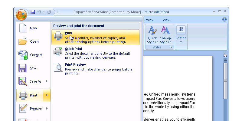 Impact Fax Server includes a convenient printer driver with each of its clients. The Stand Alone Fax Client (SACL) shows in the printer list as Impact Standalone Client.Printing to the Impact Standalone Client and Impact Outlook Client printer will automatically convert any document into a fax and attach it in a New Fax Message.Open the document or image to be faxed.Print the document or image to be faxed.In Microsoft Word 2007 the print option is in the Office Button ( top left corner ) > Print > Print.Select the Impact Stand Alone Client printer to fax with the Impact Stand Alone Fax Client.Select the Impact Outlook Client printer to fax with the Impact Outlook Fax Client.Select the Impact Fax Server printer to fax with the Impact Fax Server.When the selection is finished, click on the OK button to print.( or Print button, depends on the application )The Fax Message dialog appears with the printed document or image as an attachment. Thank you for using Impact Fax Server. Click here to see more tutorials.