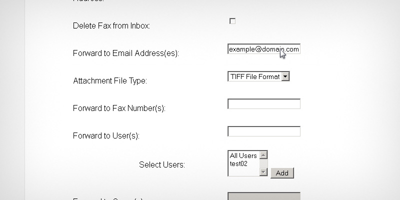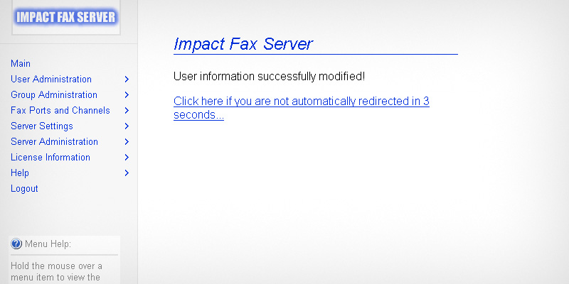 To reach the Impact Fax Server Administrator login, open a web browser and type localhost:1172 as a regular website. Enter the password, and click on the 'Submit' button.The Fax Server Administration page appears. All general information about the server can be found on this Main page.To configure the Fax forwarding, go to the User Administration > Modify User.Select the User that you wish to forward faxes from.Scroll down the Modify User page to find the Forwarding options. The user can forward faxes as an Email Attachment, Forward to a Fax Number, Forward to User(s), and/or Forward to Groups.Enter the email address to forward faxes to beside Forward to Email Address(es)Select the file format of the delivered attachments from the Attachment File Type dropdown list.To forward faxes to a specified fax number, enter the fax number beside Forward to Fax Number(s).To forward faxes to specified user(s), select the user from the Select Users list, and click on Add button. When finished, click on the Submit button on the bottom of the page.If the user information is successfully modified, the following page appears. Thank you for using Impact Fax Server. Click here to see more tutorials.