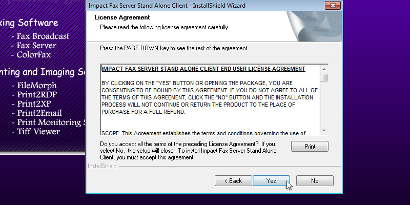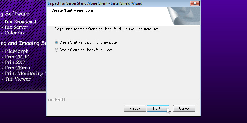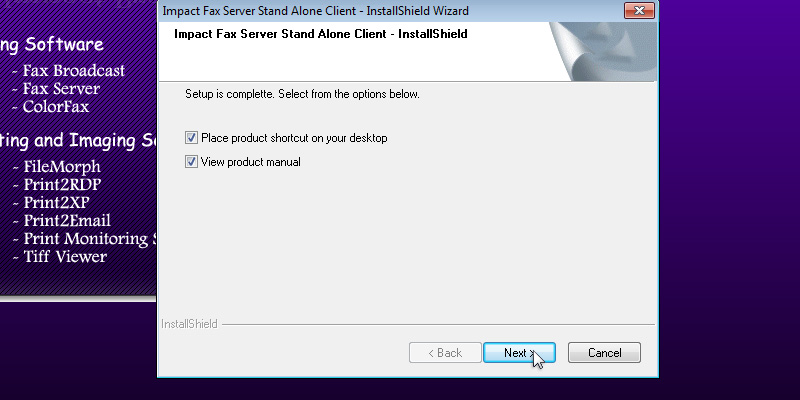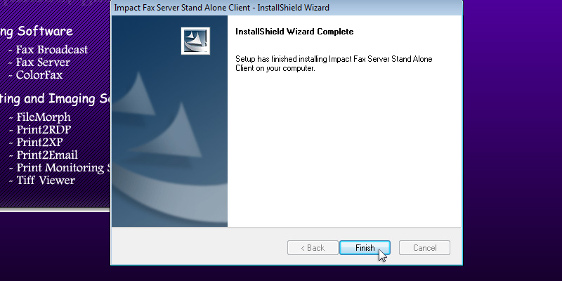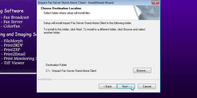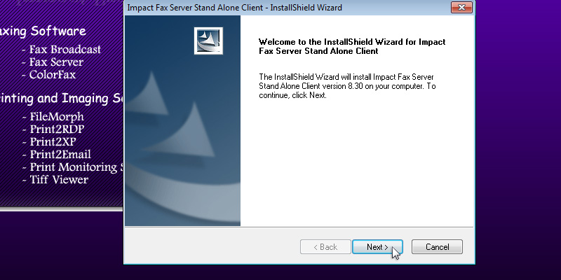 Run the Impact Fax Server installer, and select the Impact Fax Server Standalone Client product to begin the installation.The following screen will be displayed. Click the 'Next' button to continue.Review the license agreement, and press 'Yes' to continue.The next screen will present an option of installing Standalone Client for all users or just the current user. Press 'Next' to continue.Enter the IP address of the Fax Server.Select the installation directory of the Standalone Client or use the default destination folder. Press 'Next' to continue.The InstallShield Wizard will install the Standalone Client.The following dialog will appear, and the user can select the desired options and press the 'Next' button to continue.Press Finish to complete the installation. Thank you for using Impact Fax Server Standalone Client. Click here to see more tutorials.