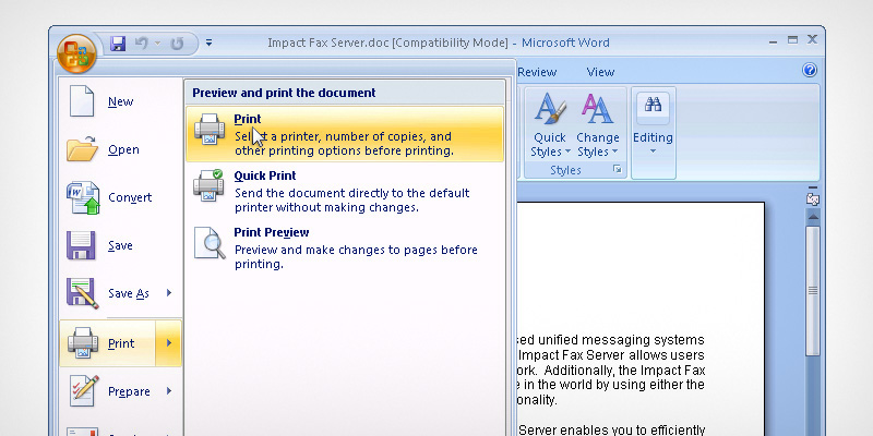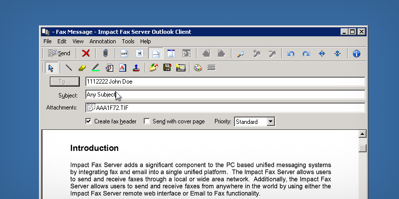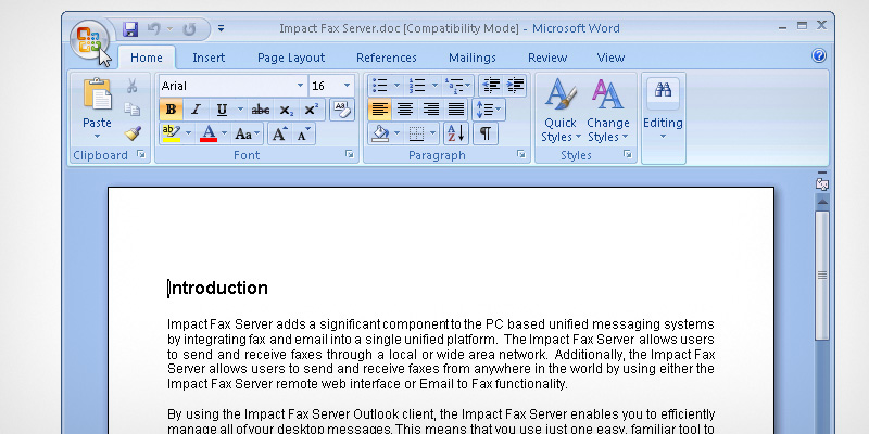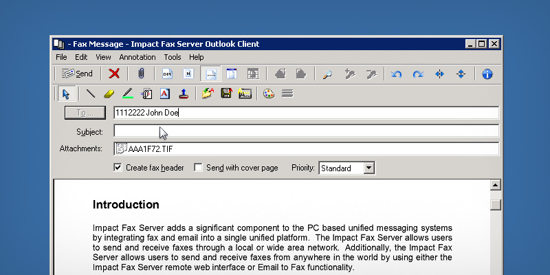 Printing to the Impact Outlook Client printer will automatically convert any document into a fax and attach it in a New Fax Message.Open the document or image to be faxed.Print the document or image to be faxed.In Microsoft Word 2007 the print option is in the Office Button ( top left corner ) > Print > Print.Select the Impact Outlook Client printer to fax with the Impact Outlook Fax Client.The Fax Message dialog appears with the printed document or image as attachment.Type the fax number beside To... button. Optionally the user can add an username after the fax number, separated by a simple space character or click on the button to view contacts from Address Book.Type any subject beside the Subject.When finished, click on the Send button to send the fax. Thank you for using Impact Fax Server Outlook Client. Click here to see more tutorials.
