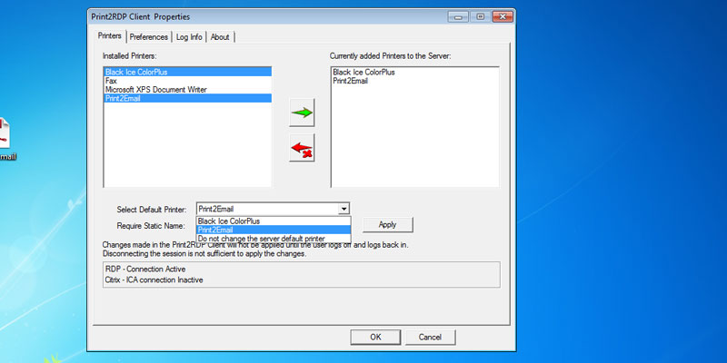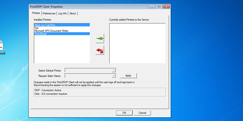 In the Print2RDP Client Properties, the user can add installed printers to the server,
