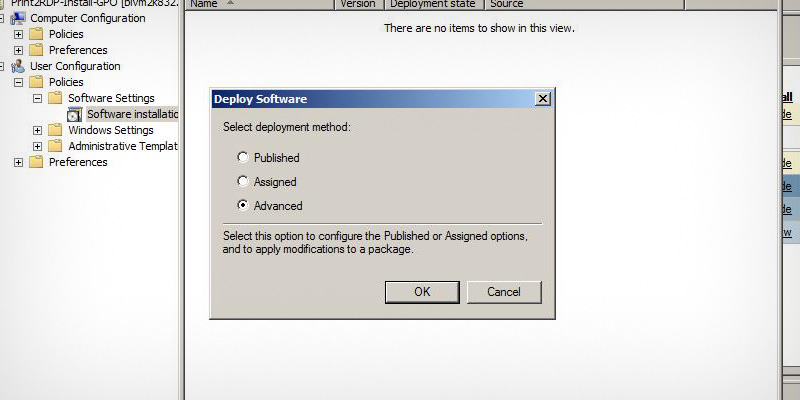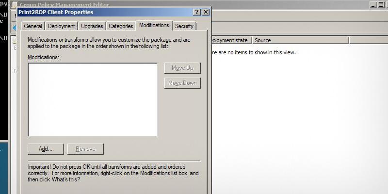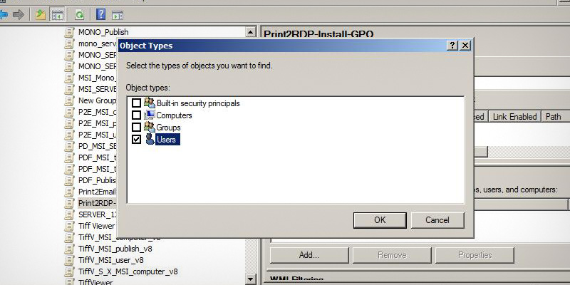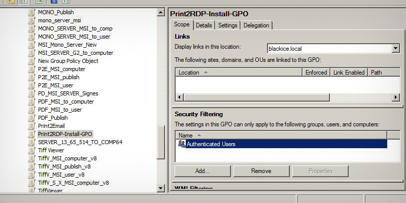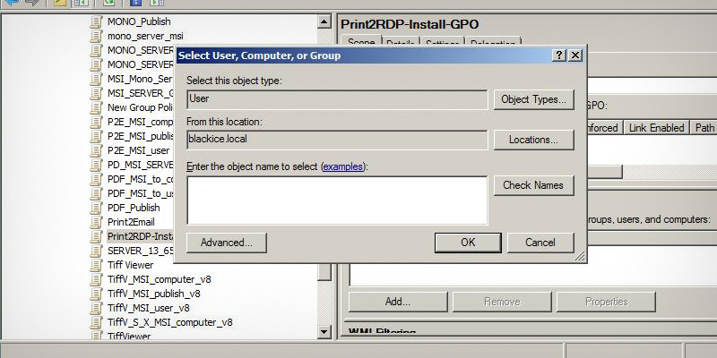 Before start, make sure that the deployable Print2RDP MSI file is in the shared folder (Distribution Point) and the folder has the appropriate rights. An existing transformation is needed to complete this tutorial. New transformation file can be created easily following our How to use MSI Client Install documentation.Go to the Start > Administrative Tools > Group Policy Management.In the Group Policy Management, expand the Forest and Domain.Select the Group Policy Object category.Right click on the Group Policy Object category, and click New.Enter the name of the new Group Policy Object, and click Ok to create the new object. When finished, double click on the created Group Policy Object.In the selected Group Policy Object, click on the Settings tab, right click on the panel and select the Edit.The Group Policy Management Editor opens. The Administrator can assign the deployable product for users or computers in the domain. Now the product will be assigned to a User.Double click on the User Configuration item.Double click on the Policies item.Double click on the Software Settings item.Double click on the Software installation item.Right click on the Software installation panel, and select New > Package...Browse the distribution point folder, select the MSI package and click Open.Select Advanced, and OK.In the Properties, go to the Modifications tab, and click on Add button.Browse the folder where the transformation file is located. Select the file, and click the Open buton.In the Properties, go to the Deployment tab, and select the Assigned at the Deployment type area, and basic at the Installation user interface options area. Click Ok when finished, and close the GPO Editor.In the Group Policy Management, select Scope tab.Under the Scope tab, the Authenticated Users group applies to every user who logs in. In this case it will only be deployed to one user. Select Authenticated Users and click on Remove.Click OK.Click Add... button to add users.Check only the Users, and click Ok.Click on the Advanced... button.Click Find Now button, and select the users to add. When finished, go back to the Group Policy Management.The Administrator need to link this GPO to a domain. Right click on the domain, and select Link and Existing GPO...Select the Group Policy Object, click OK, and the Group Policy Object has been configured. The product will be deployed when the user logs in. Thank you for using Black Ice Print2RDP. Click here to go back to the Tutorials.
