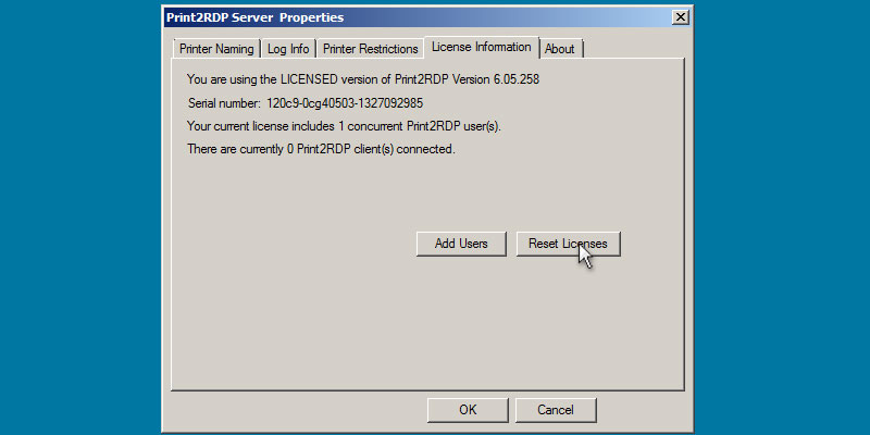 Go to Start menu and start the the Print2RDP Server.In the Print2RDP Client Properties, go to the License Information tab to see the current license. To reset the licenses, click on the 'Reset Licenses' button.The following dialog will pop up. If the user click 'Yes', the connected printers will be deleted, and the number of used licenses will be set to zero.Once the process is complete they will be prompted to log off and start a new session to recover their printers. Thank you for using Black Ice Print2RDP. Click here to go back to the Tutorials.