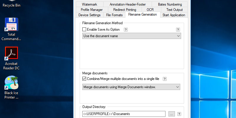 Go to Control Panel > Devices and Printers.Right-click on the Black Ice Printer Driver, and select the Printing Preferences.In the Printing Preferences, go to the Filename Generation tab check the 'Combine/Merge multiple documents into a single file' option.When finished, press the OK button.Now printing to the driver will show up the Merge Documents window. Click on the Merge Documents button to merge the listed documents into one single file. Thank you for using Black Ice Printer Driver. Click here to see more tutorials.